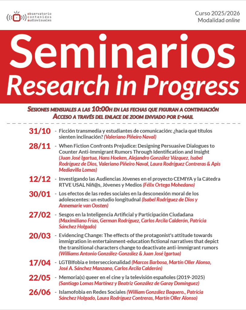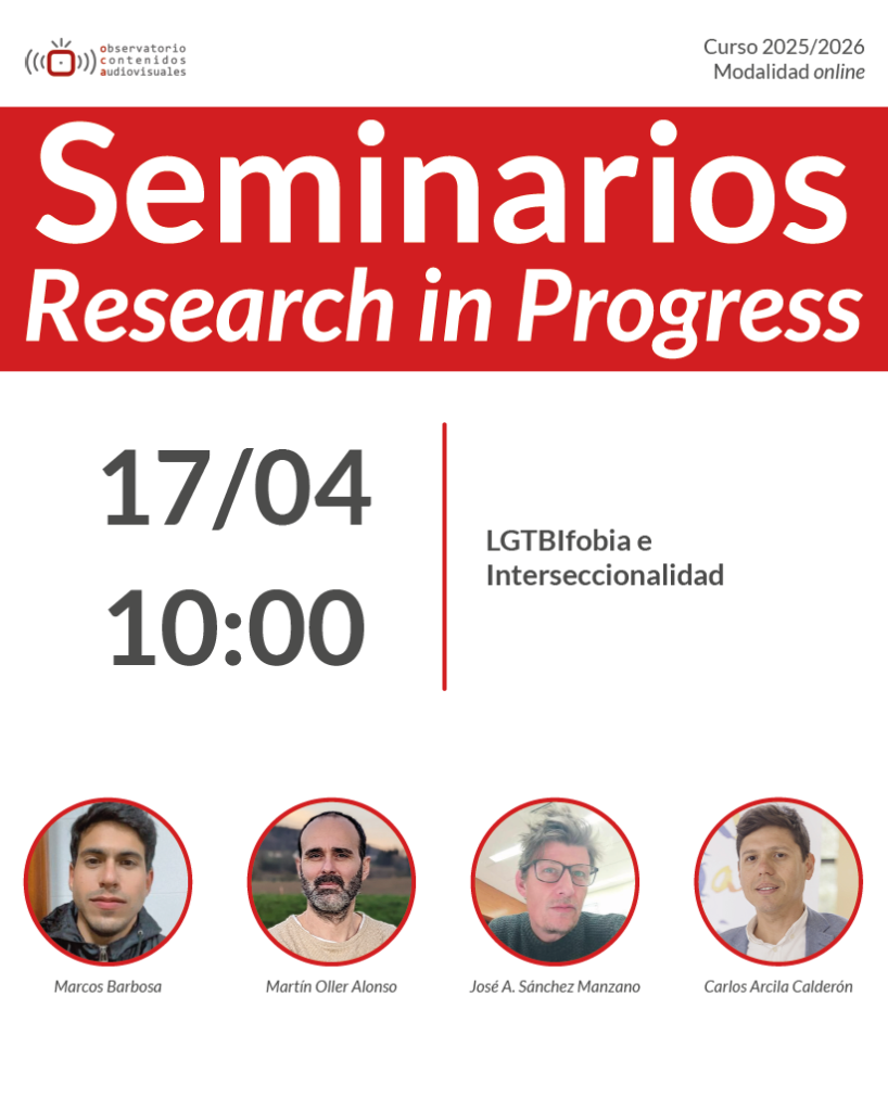 El próximo 17 de abril, a las 10:00 h, tendrá lugar, en modalidad online, una nueva sesión de los Seminarios Research in Progress del curso 2025/2026, organizada en el marco del Observatorio de los Contenidos Audiovisuales. (OCA) En esta ocasión, la sesión estará dedicada a “LGTBIfobia e Interseccionalidad” y contará con la participación de Marcos Barbosa, Martín Oller Alonso, José A. Sánchez Manzano y Carlos Arcila Calderón.