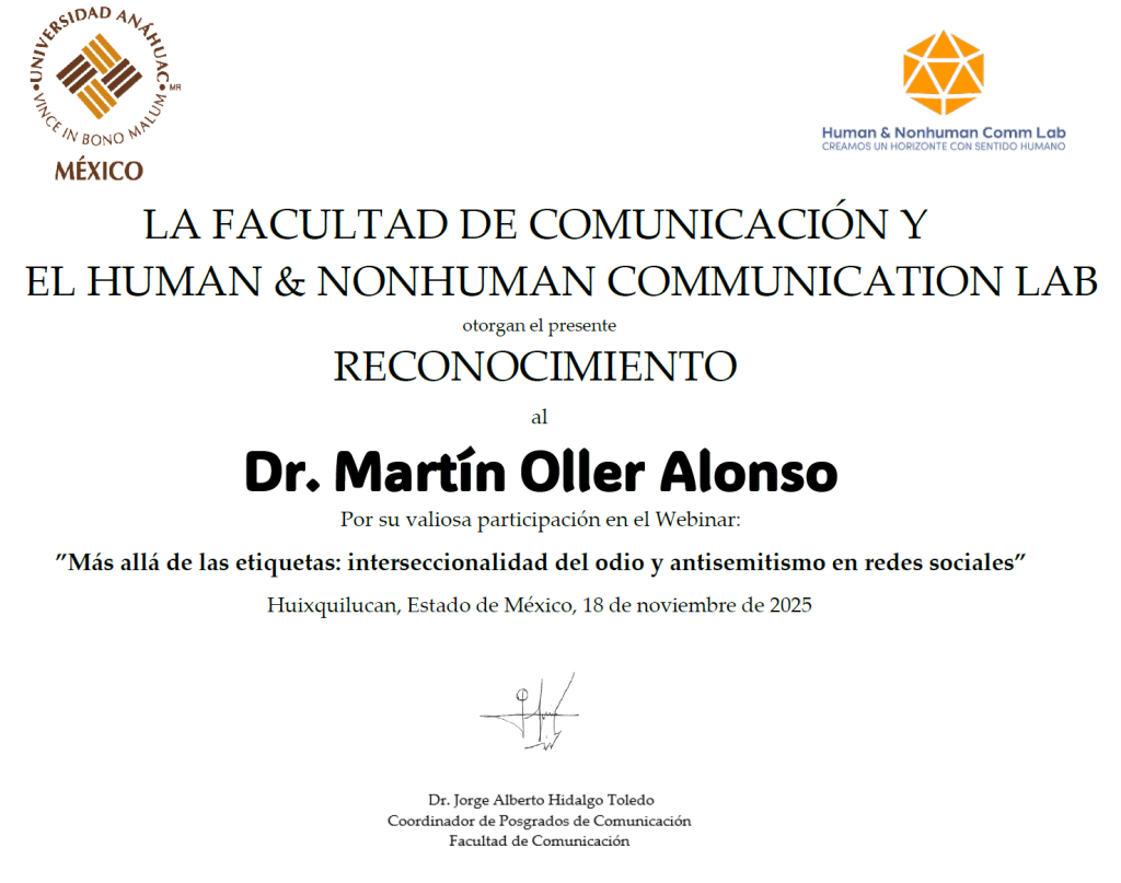 On 18 November 2025, the Human & Nonhuman Communication Lab of the Faculty of Communication at Universidad Anáhuac México, in collaboration with the Observatorio de los Contenidos Audiovisuales (OCA) (University of Salamanca) hosted the webinar “Más allá de las etiquetas: interseccionalidad del odio y antisemitismo en redes sociales”.